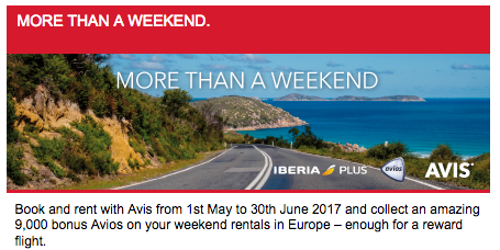 8,300 Bonus Avios on Avis weekend rentals of 3 or more days of a minimum group C vehicle in Spain, United Kingdom, Italy, France, Germany, Portugal, Switzerland, Belgium and the Netherlands. Full details Until Jun 30, 17