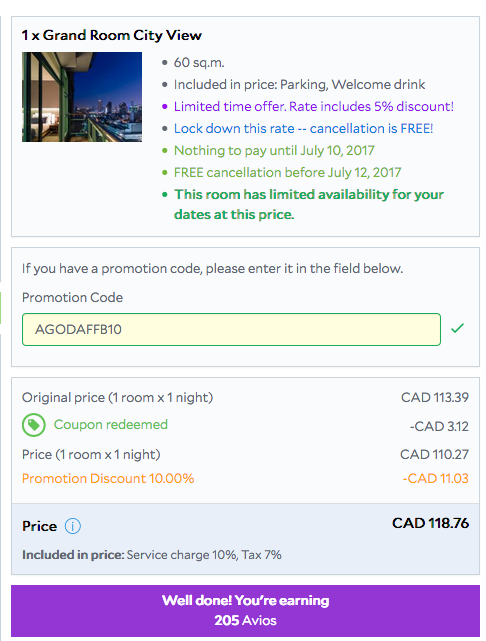 Be sure to input the code when you book online at Agoda (you must book via this link to have the code work) This code is valid until December 31, 2017