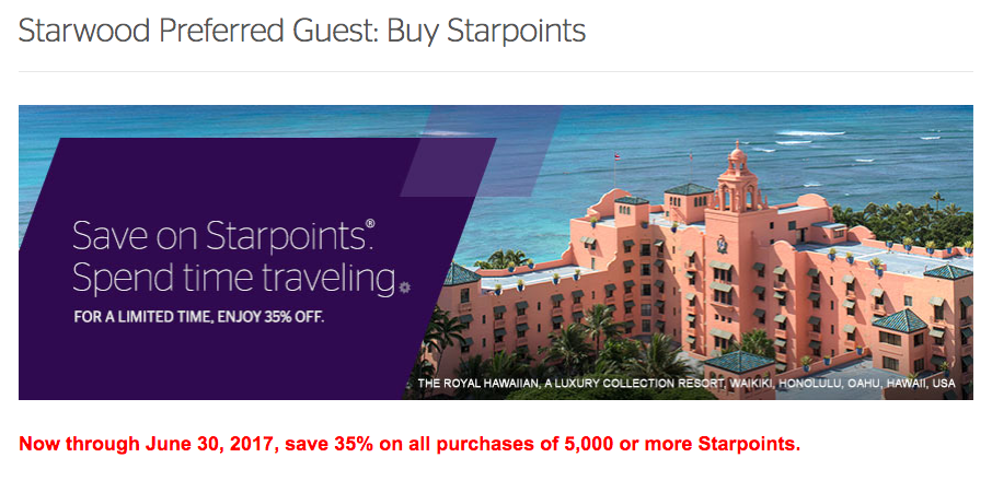 It has only been about a month since we had the last buy Starpoints offer and now a new offer has come out and it is the best non-tiered public offer ever on purchasing Starpoints. The discount is 35% this time if you buy 5,000 or more Starpoints. Your yearly limit remains at 30,000 Starpoints so if you haven’t bought any yet this year this could be the time to do. This