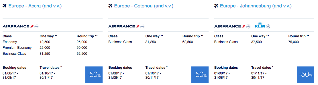 Class! This month there are actually more 50% off Business Class offers than we have seen in quite some time, however they are for the not as popular routes like Europe-Kuwait, Cayenne, and Accra. However there are some stand out offers like 50% off Europe to Johannesburg. There is only one North American route this month and that is 25% off Economy Class between New York and Paris Orly.