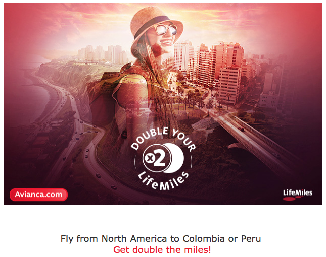 Double LifeMiles when you fly on Avianca from North America to Colombia or Peru. Book online at Avianca. Book by Aug 31 for travel Sep 1 – Oct 31, 17