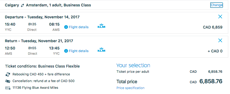 rate between YYC & AMS for 93,750 miles and C$620.20 in taxes and