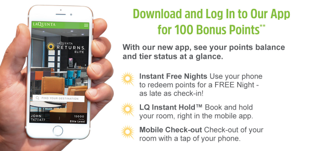 100 FREE La Quinta Returns points when you download and log in to the La Quinta App. Full details Until Dec 31, 17