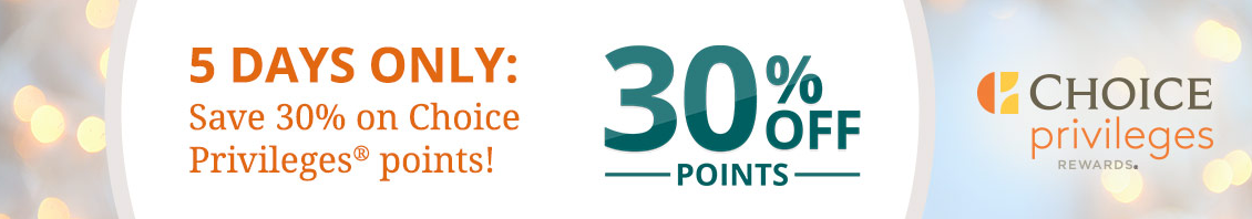 30% Discount when you buy 5,000 or more Choice Privileges points online. Buy Points Here Until Nov 17, 17