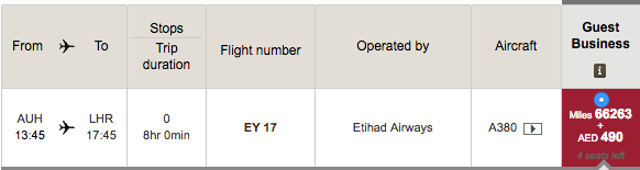 For example, you need 66,263 miles to fly one way in business class between Abu Dhabi and London.