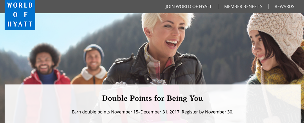 Double World of Hyatt Points on all Hyatt stays Worldwide that are booked online at Hyatt.com or on the World of Hyatt app. Register Online (Registration is required) Register by Nov 30 for stays until Dec 31, 17