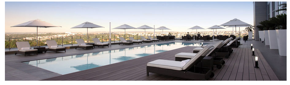 a pool with lounge chairs and umbrellas