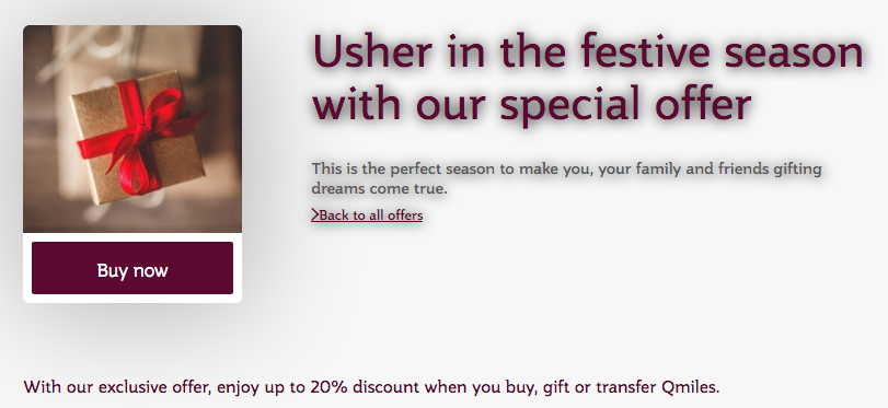 Receive up to a 20% Discount when you buy, gift or transfer QMiles. Full Details Until Dec 31, 17