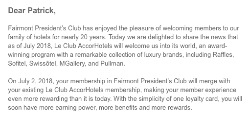 We now have confirmation on the absorption of FPC into Le Club AccorHotels from the email sent to us today from Fairmont: