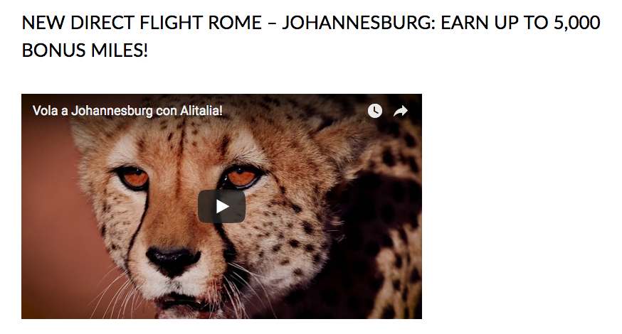 Earn up to 5,000 Bonus MilleMiglia Miles when you fly Alitalia between Rome and Johannesburg. Full details