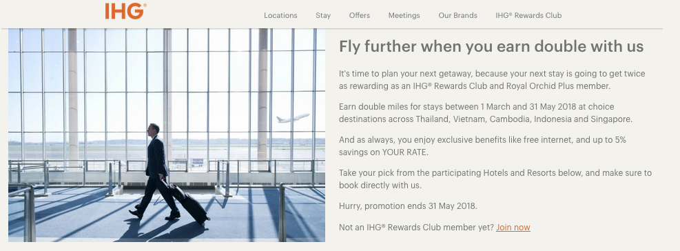 Double ROP Miles for stays at IHG Hotels in Thailand, Vietnam, Cambodia, Indonesia and Singapore. Full details & online booking Until May 31, 18