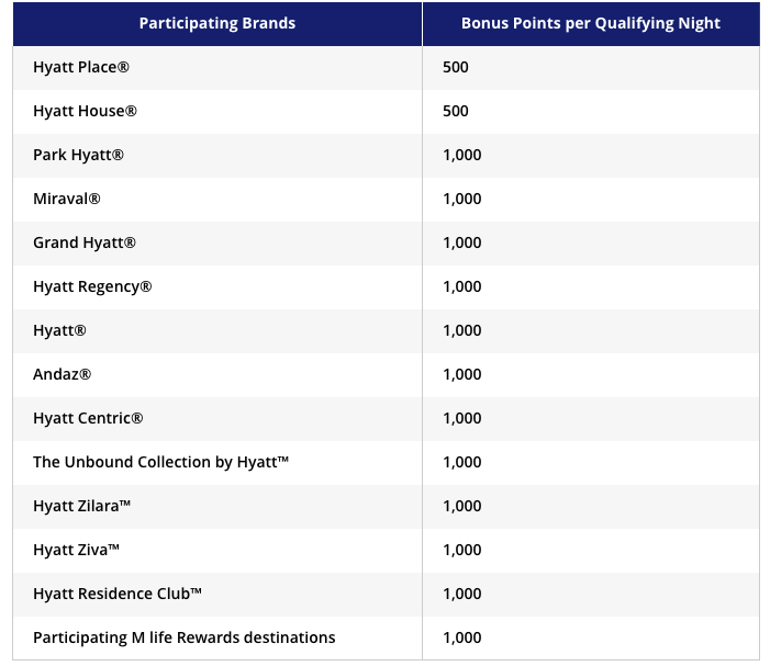 – 1,000 bonus points per night at all other Hyatt brands.