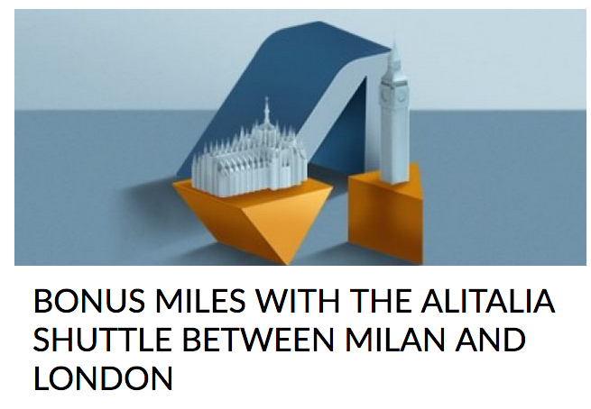 Earn up to 1,500 Bonus MilleMiglia Miles when you fly Alitalia between Milan-Linate and London City Airport. Full details Until Jun 30, 18
