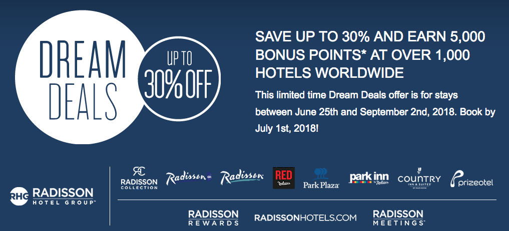 – 5,000 Bonus Radisson Rewards Points and up to 30% off when you book a stay at over 1,000 hotels Worldwide! More… Book by Jul 1 for stays until Jun 30 in the U.S./Canada or from Jun 25 – Sep 2, 18 for the rest of the world