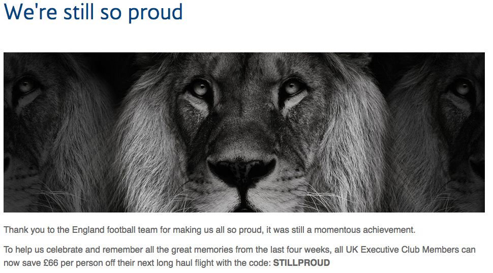 British Airways is offering residents of the U.K. who are Executive Club members a discount to show they are still proud of the English soccer team after they lost to Croatia.