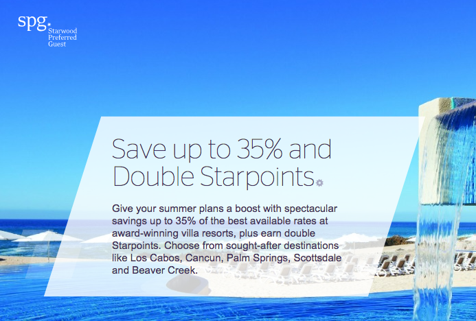 Double Starpoints and up to 35% off stays at Starwood resort locations in the U.S. and Mexico. Full details and online booking. Book by Jul 12 for stays until Dec 20, 18
