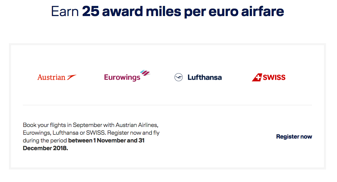 purchased for travel on Lufthansa, Austrian, Swiss or Eurowings. Register online (Registration is required) Book by Sep 30 for travel Nov 1 – Dec 31, 18