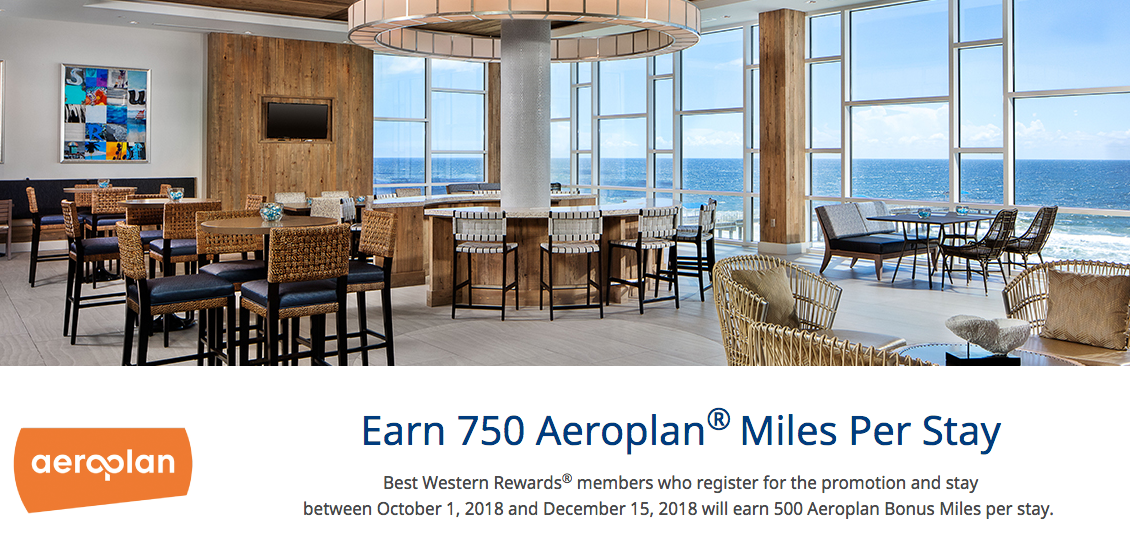 Earn 500 Bonus Aeroplan Miles for each stay at Best Western Hotels in Canada, the United States, or the Caribbean Islands . Full details, online registration and booking (Registration is required) Until Dec 15 18