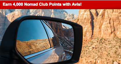 4,000 Nomad Club Points for Avis rentals of 3 or more days in Europe, The Middle East, Africa and Asia. Full details Book by Oct 31 for rentals until Dec 31, 18