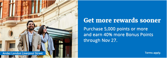 40% Bonus World of Hyatt Points when you buy points. Note there is a minimum point purchase requirement that varies by member. Buy World of Hyatt Points here. Until Nov 27, 18