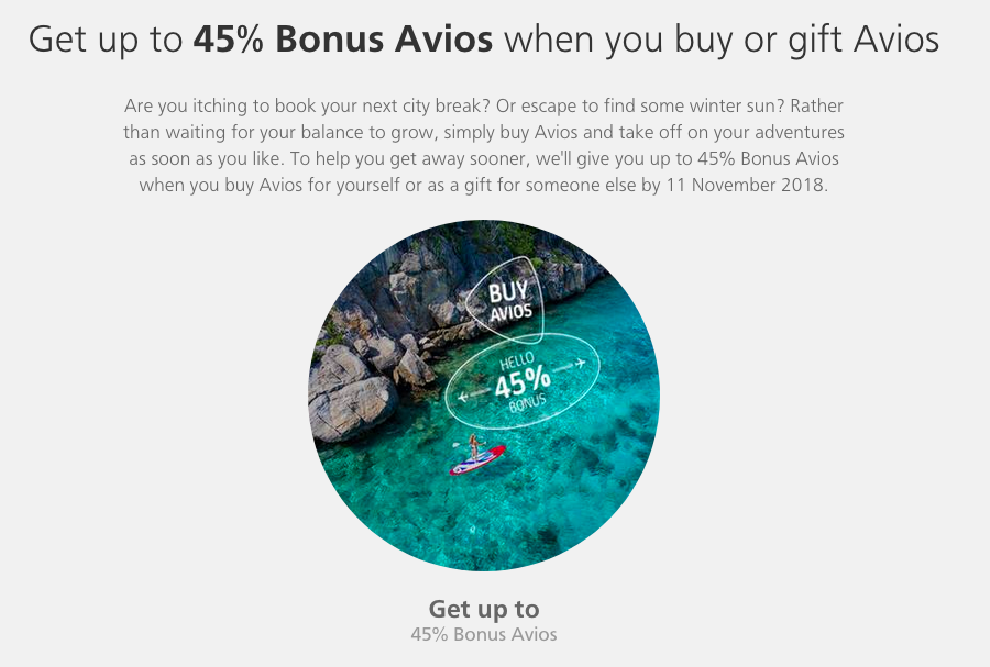 Earn up to 45% Bonus Avios when you buy or gift Avios. Buy and gift Avios here. Until Nov 11, 18