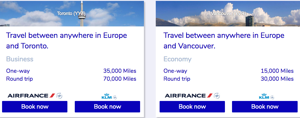 destinations in Europe. Some of the better offers are the flat rates of 35,000 each way in Business Class from Toronto and New York which sees 14,000 miles each way in Economy Class.