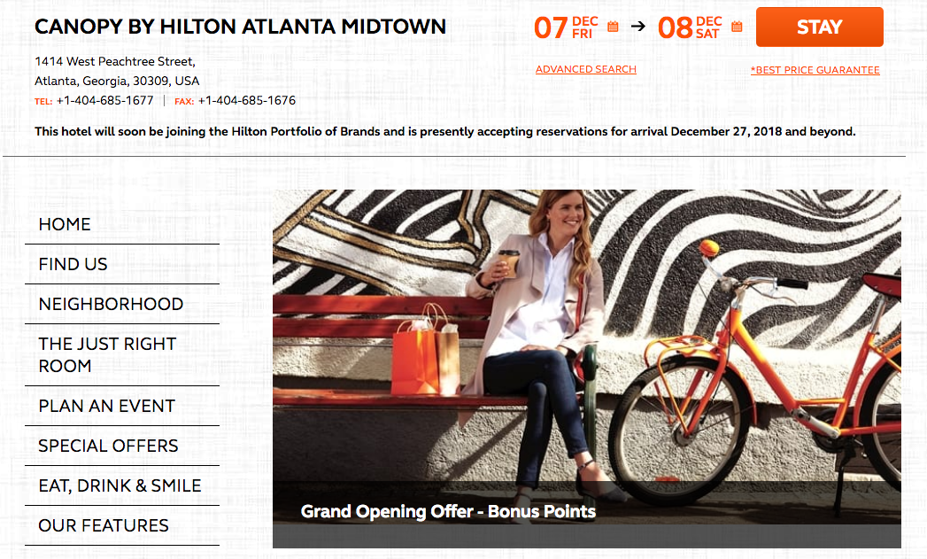 1,000 Bonus Honors Points PER NIGHT for stays at the new Canopy by Hilton Atlanta Midtown. Full details & online booking Book now for stays Jan 6 – Feb 28, 19