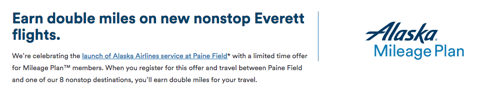 Earn Double Mileage Plan Miles when you fly on Alaska Airlines between Everett – Paine Field (PAE) and Las Vegas, Los Angeles, Orange County, Phoenix, Portland, San Diego, San Francisco or San Jose. Full details and online registration (Registration is required) Feb 11 – Mar 31, 19