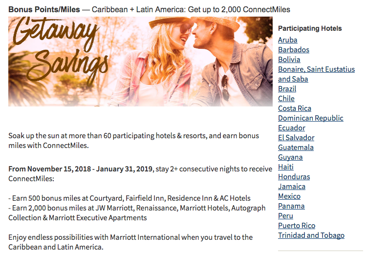 Earn up to 2,000 Bonus ConnectMiles when you stay 2+ nights at participating Marriott Hotels in the Caribbean and Latin America. Full details & online booking. Until Jan 31, 19