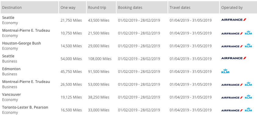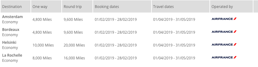 Here are the mileage requirements for flying to or from Amsterdam and/or Paris (the mileage amount will vary for other