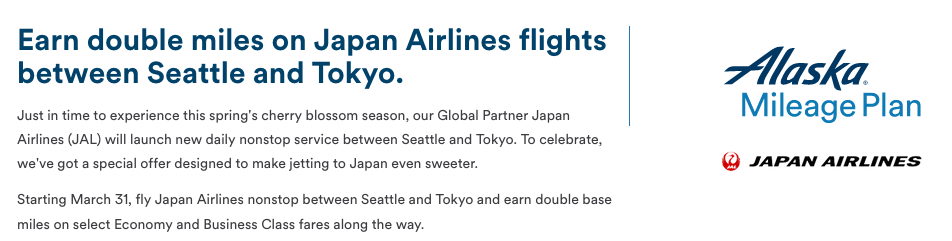 Double Mileage Plan Miles when you fly on Japan Airlines flights between Seattle and Tokyo. Register Online (Registration is required) Mar 31 – May 31, 19