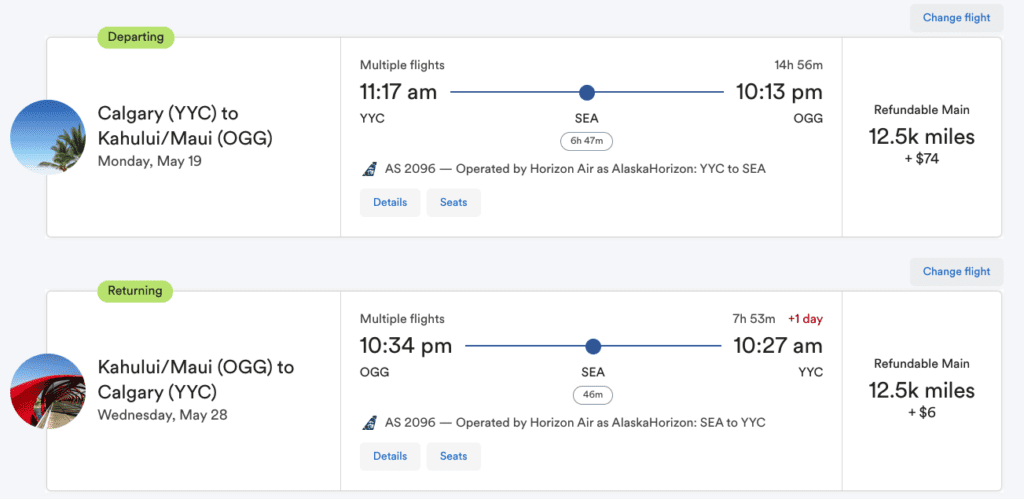 And even though the sale page states travel must originate in the U.S., the sale prices are also applicable to departures from Canada. For example, here is Calgary to Maui at the advertised sale price of 12,500 miles each way