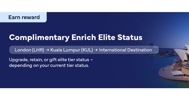Get rewarded with Elite Status when you purchase a return flight from London to Kuala Lumpur that includes a connection to any Malaysia Airlines international destination. Book now for travel until Jun 30, 25. Click here to book this offer.