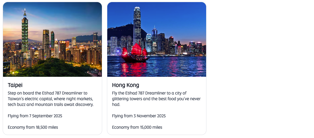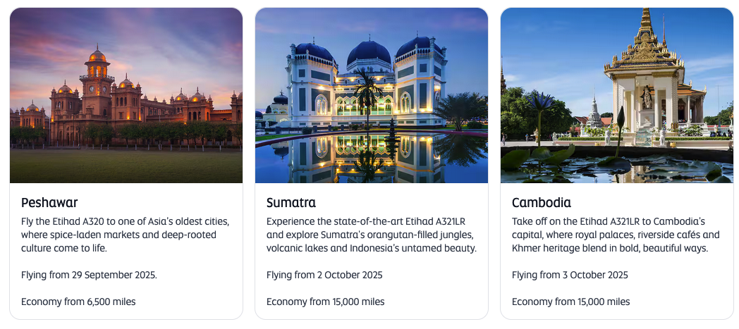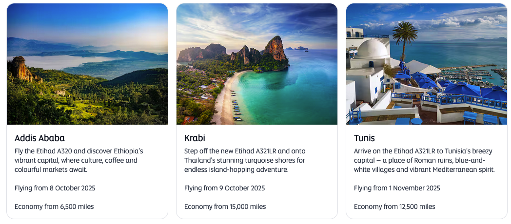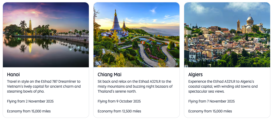 Etihad have launched an award flight flash sale offer 50% off Economy and 30% off Business & First when booking a GuestSeat with Etihad Guest Miles to/from Abu Dhabi and Peshawar, Medan, Phnom Penh, Addis Ababa, Krabi, Tunis, Hanoi, Hong Kong, Chiang Mai, Algiers.. This offer must be booked by September 2 and is good for travel until Dec 15, 25