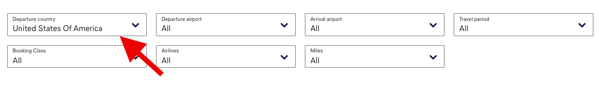 To find what offers are available from your country simply scroll down on the Mileage Bargains and select your country in the “Departure Country” box and the page will update with all the offers available for that location. You can then further narrow down your search by departure airport, service class, airline etc.