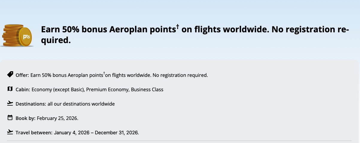 Earn 50% bonus Aeroplan points on all Air Canada flights worldwide. This offer is valid in Economy (except Basic), Premium Economy and Business Class. No registration is required. Book by Feb 25 for travel until Dec 31, 26. Not valid for tickets booked before Jan 4. Click here for more details.